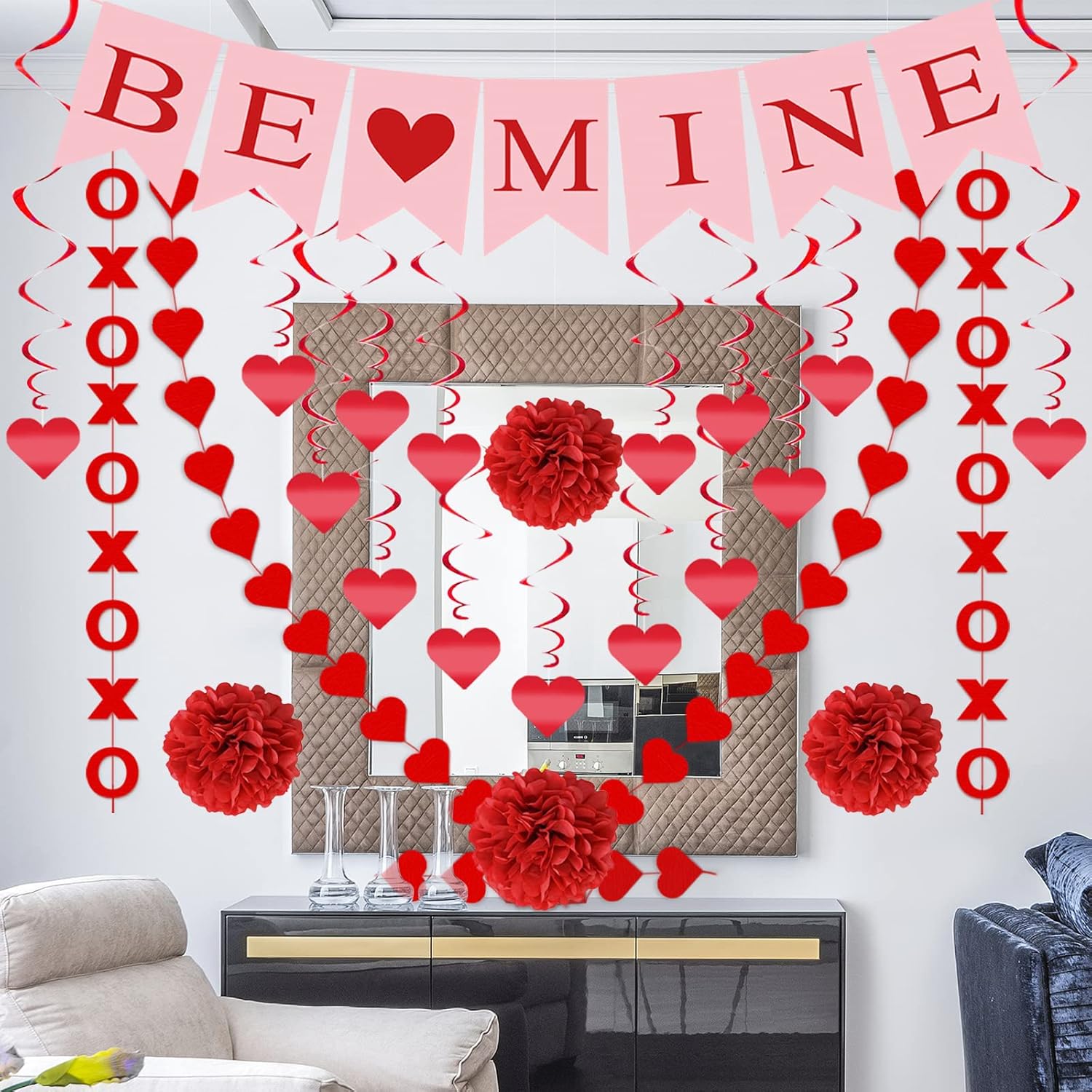 - WELL DESIGNED: Package includes 1 BE MINE banner string, 12 heart swirls, 4 paper balls, 2 XO strings and 2 heart strings. String measures about 9.8ft, each love banner 7.1x5.2in, heart and XO strings 6.6ft. Perfect size for home or party decorations, readily turning a room or place into a celebration of love.